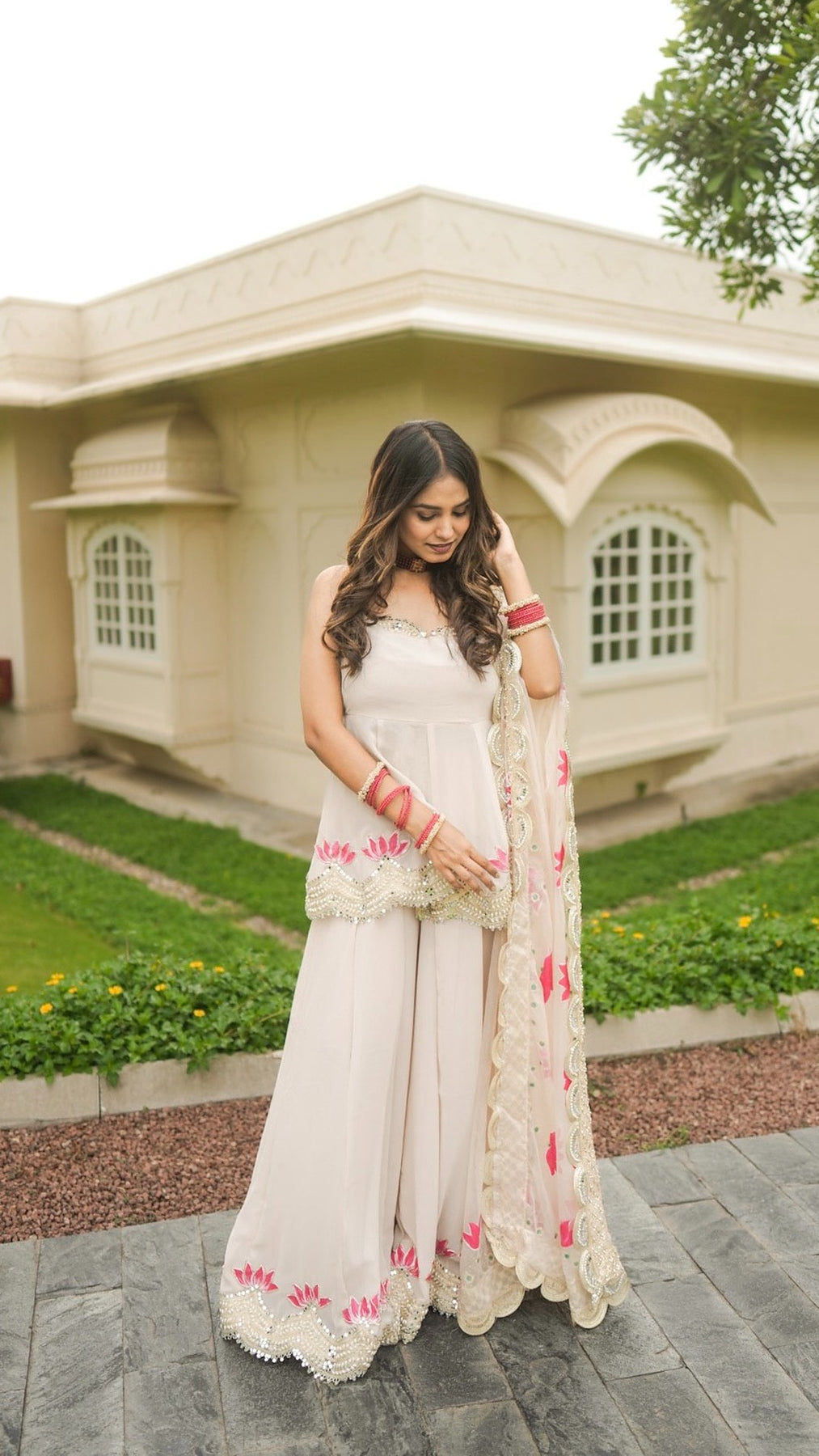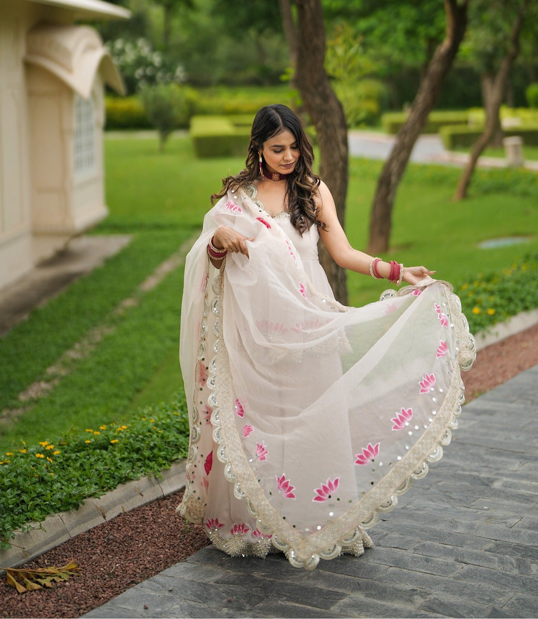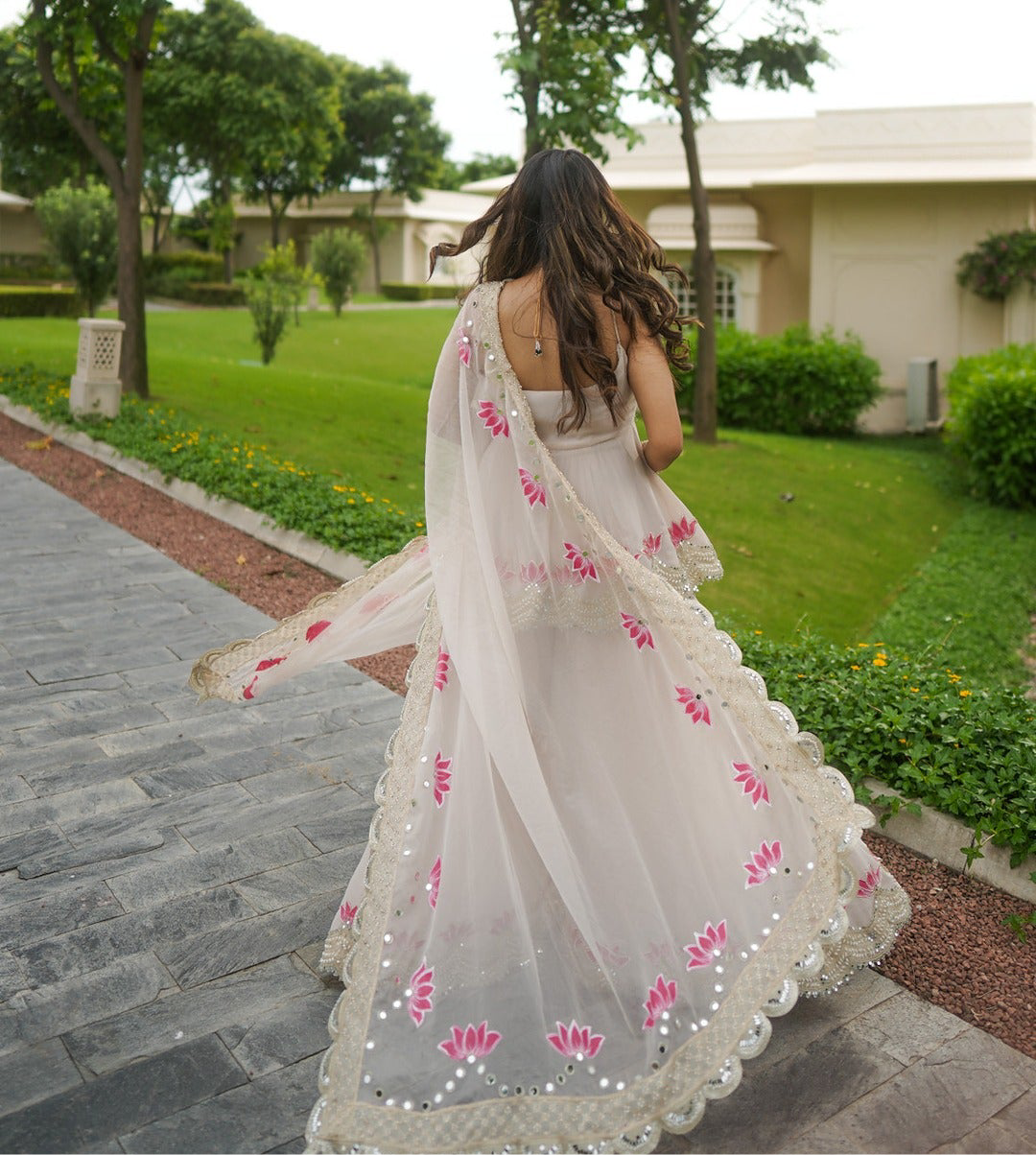 This georgette masterpiece brings together delight hand painted and fine embroidery making it a perfect pick for the modern bride
